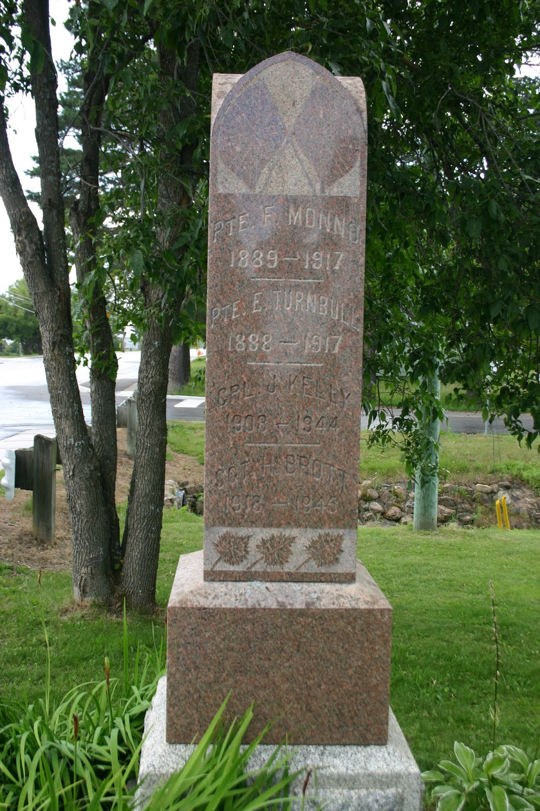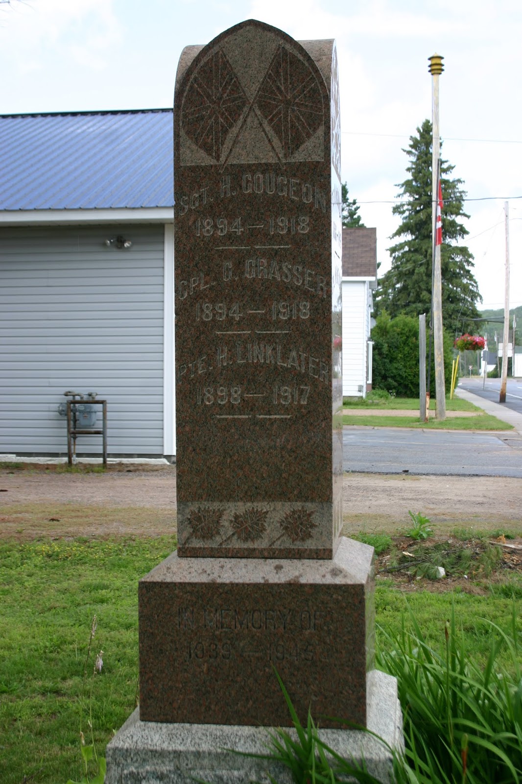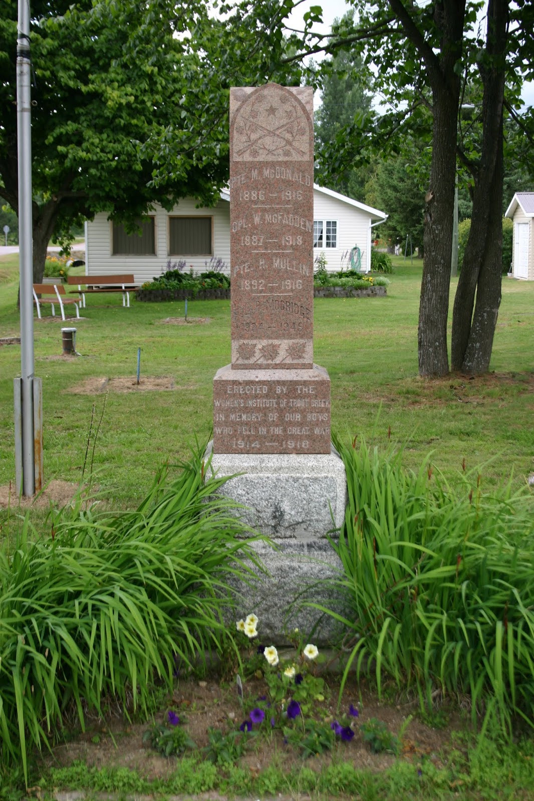 This memorial was constructed in August 1920, in memory of "Our Boys who fell in the Great War 1914 - 1918". This Gothic shaped monument that was created by Hayes Bros, is constructed from Scotch Granite and stands seven feet high. It is traditionally engraved with names, dates, flags, rifles, and maple leafs. The monument was erected by The Women's Institute of Trout Creek at a total cost of Two Hundred and Fifty Dollars. The names of those from the community who gave their lives during the Second World War were subsequently added.