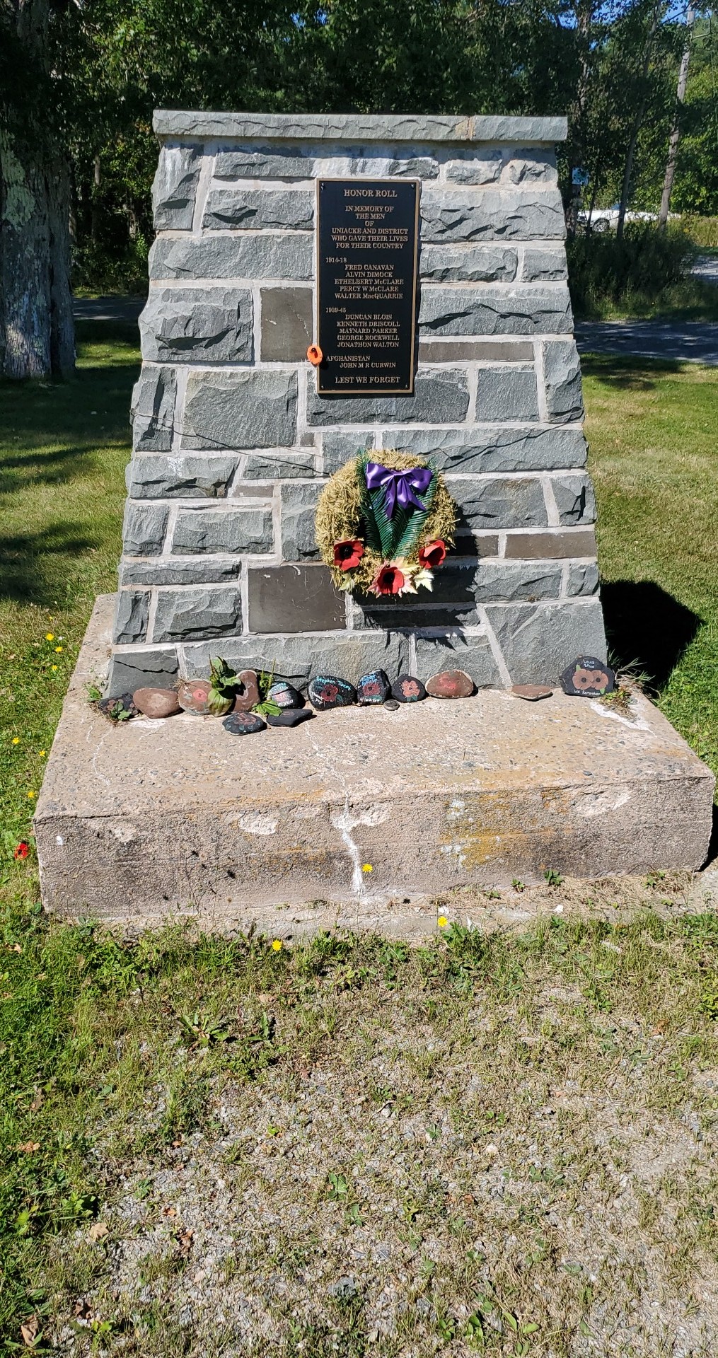 The Uniacke and District Memorial was erected November 6th, 1976 in memory of the Men of Uniacke and District who gave their lives for their country. The memorial was dedicated on November 11th 1976. The existing war monument in Mount Uniacke originated when the Uniacke Ratepayers Association realized that the Community Hall with its memorial kitchen had deteriorated beyond economical repair. The idea of erecting a monument was initiated by Maynard Parker, a First World War veteran whose son, Maynard, was killed during the Second World War, and Jack MacDonnell, a Second World War veteran. A three member committee was formed to dispose of the building and to construct a monument to replace the memorial kitchen. This committee was comprised of the following: Donald William Nicoll, Maynard Parker, and James L. Paulley. After removing the old community hall, the property PID #45138120, registered in the name of "Village of Mount Uniacke", was prepared and the monument was constructed by members of the Uniacke and District Volunteer Fire Department with other volunteers. The monument was completed on November 6th, 1976. The original plaque was replaced with one bearing an additional name. The former plaque is in the Memorabilia room at the Royal Canadian Legion, Branch 165, Mount Uniacke, Nova Scotia.