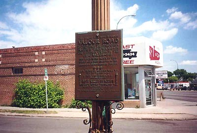 This street, renamed after the First World War, is a memorial to the three local winners of the Victoria Cross -- Cpl Leo Clark, Sgt-Maj Frederick William Hall and Lt. Robert Shankland. All three of these men lived on Pine Street, which was renamed Valour Road. The plaque was erected by the Women's Canadian Club of Winnipeg in 1925.