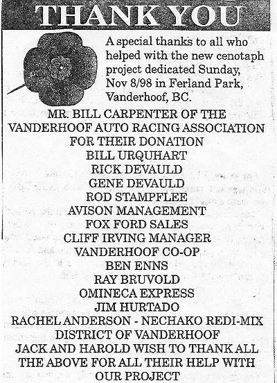 The Vanderhoof Cenotaph was rebuilt in 1998 due to age. It is dedicated to all War Veterans.