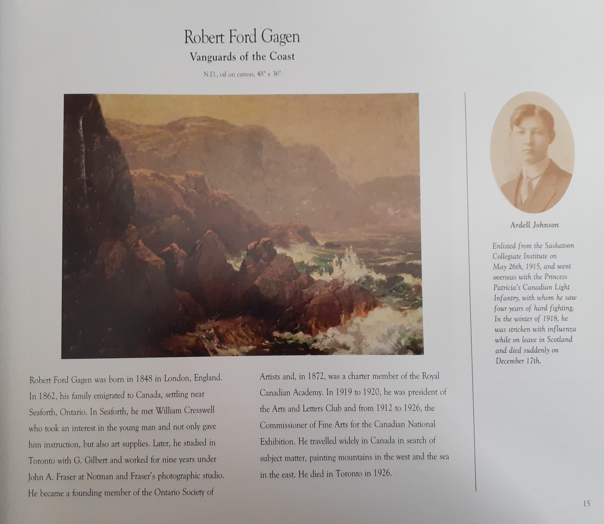 Robert Ford Gagen's Vanguards of the Coast was acquired in 1920 and dedicated to Private Ardell Johnston. Ardell enlisted from Saskatoon Collegiate on 26 May 1915. In the winter of 1918 he was stricken with influenza while on leave in Scotland and died suddenly on 17 December.