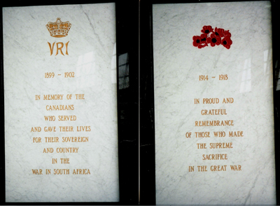 Veterans Memorial Wall was unveiled on April 16, 2005. The curving wall is 33 feet wide and stands over 11 feet tall. It consists of five white Carrara marble plaques set into white veined, black Vancouver Island marble. The original Second World War plaque is centered in the wall.
