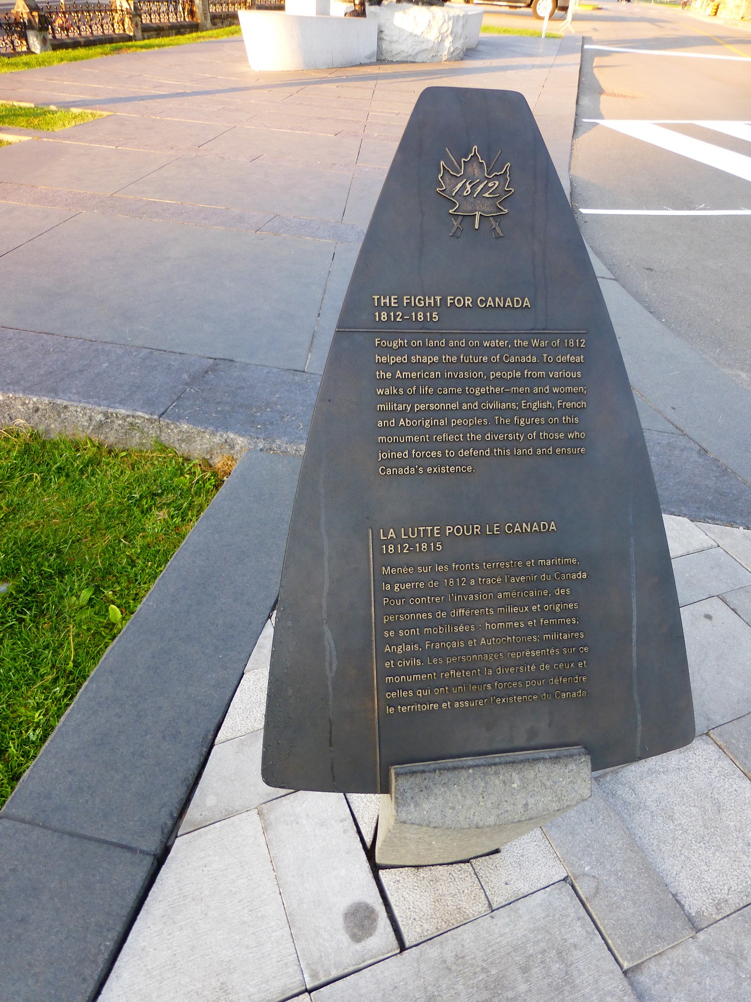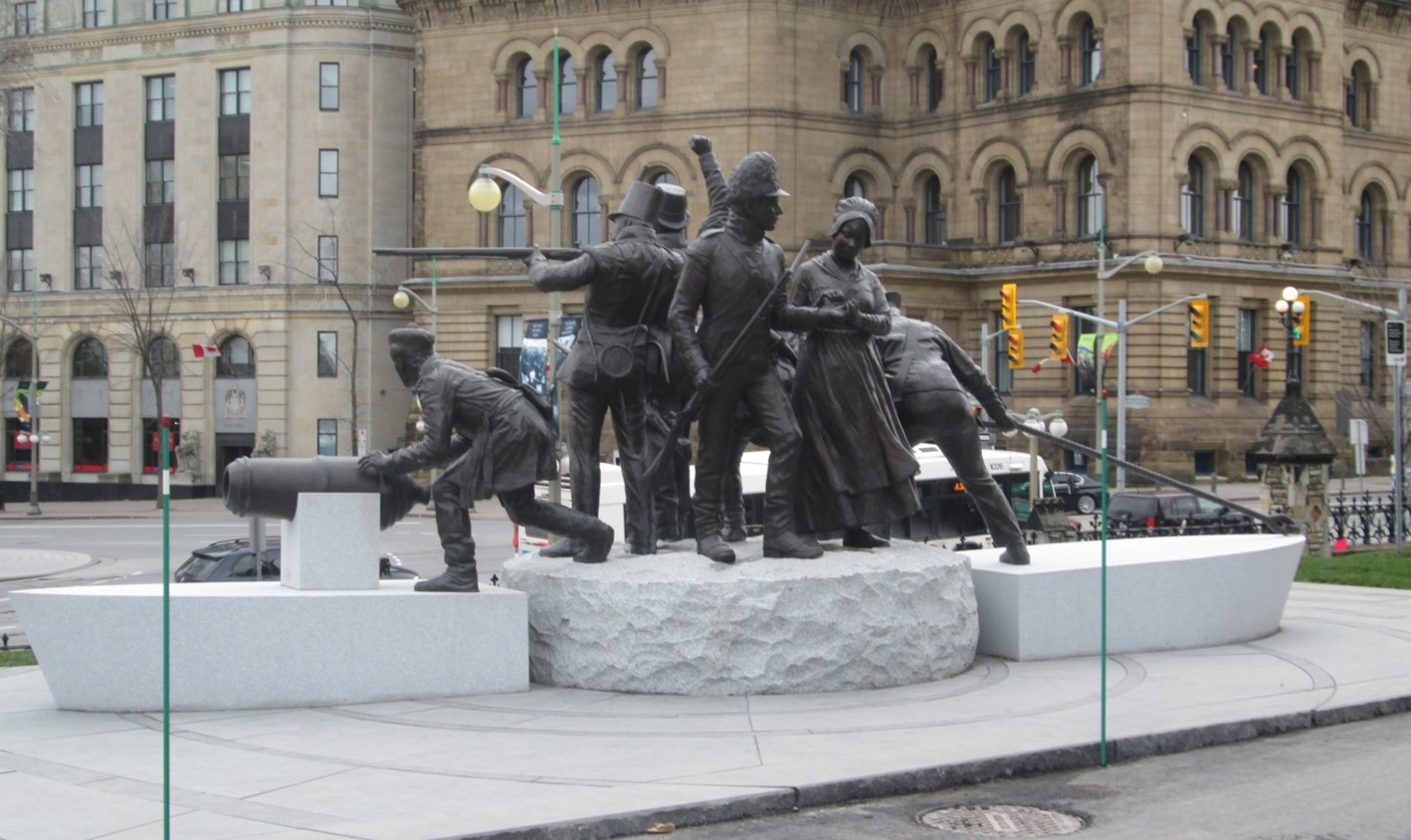It was designed by Adrienne Alison to commemorate the 200th anniversary of the War 1812. The two smooth granite boat-shaped pieces symbolize the ships used by the Royal Navy and remind us that part of the war was fought on water. Atop the rough granite center base that recalls the Canadian landscape, seven bronze figures form a circle illustrating the stages of battle. Each is approximately seven feet tall and represent the key combatants that came together to defeat the American invasion: a Métis fighter firing a cannon; a woman bandaging the wrist of a Voltigeur; a Royal Navy sailor pulling a rope; a Mohawk warrior pointing out the advancing enemy; a Canadian militiaman raising his arm in triumph, and a member of a British Army unit, specifically the Royal Newfoundland Regiment, firing a musket.