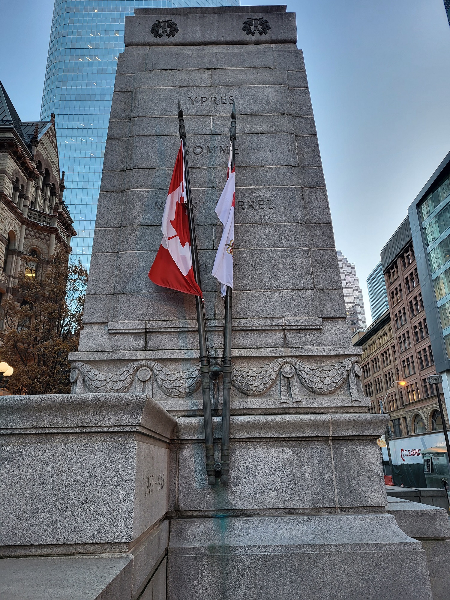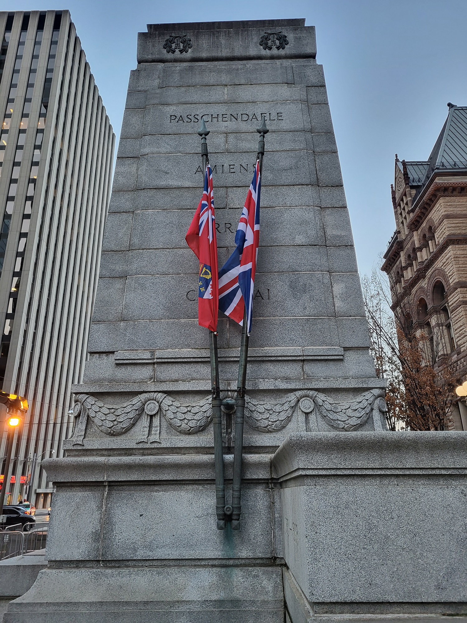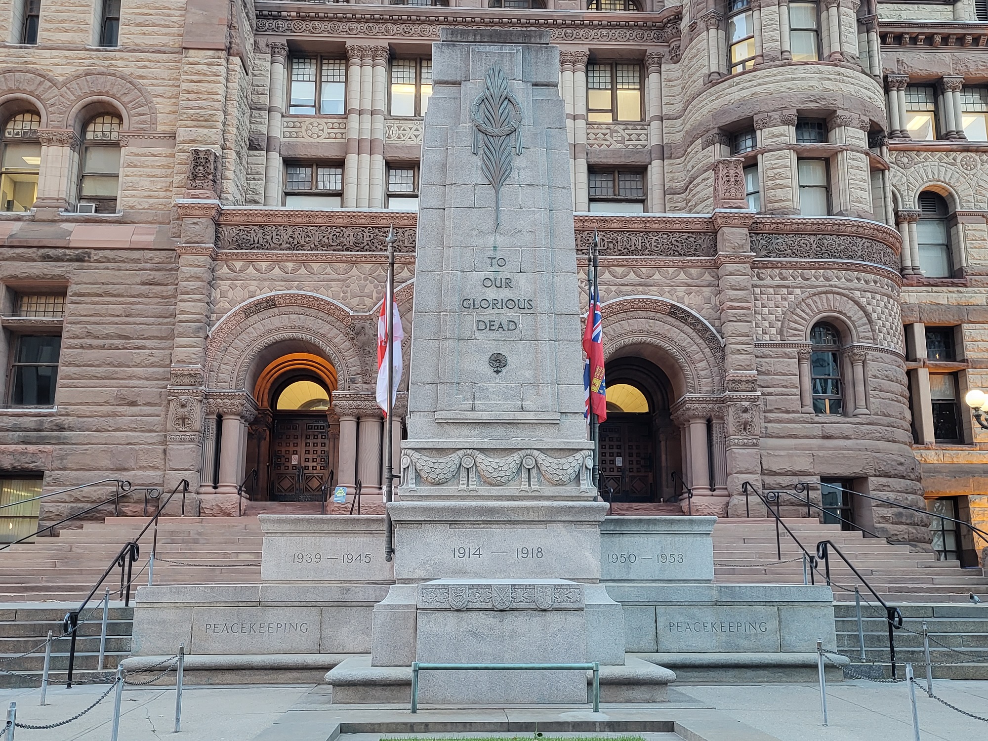William Moncrieff Ferguson served with the 14th and 35th Battalions during WWI, then returned to Toronto in 1919. In 1924 both Ferguson and Pomphrey submitted an entry in the competition for the War Memorial Cenotaph in Toronto. From the fifty designs submitted, their scheme was awarded First Premium, accompanied by a generous fee and award of $2,500 for architectural services. A watercolour perspective of their design appeared in the R.A.I.C. Journal, ii, Jan.-Feb. 1925, 4. The WW I War Memorial Cenotaph was erected on Queen Street West at Bay Street, 1925-26. This is the main memorial in Toronto for Remembrance Day ceremonies.