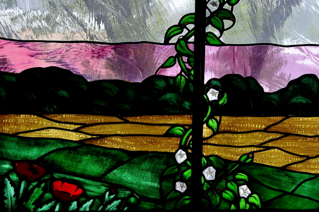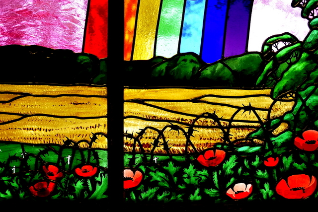 Stained glass window by David Johnson, 1992 featuring a prairie landscape, barbed wire, poppies and a rainbow. The window is a memorial to the dead of two World Wars.