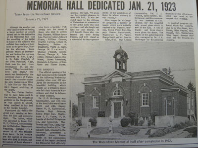 Waterdown Memorial Hall was dedicated at a Memorial Service on January 14, 1923. During the service, a commemorative tablet containing the names of all villagers who had enlisted in the First World War and the 19 who had died was unveiled. A second plaque was erected by the Royal Canadian Legion Branch 551 to the honour those who served in the great wars.
