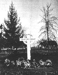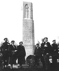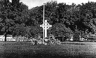 This memorial was constructed in honour of fourteen men of Waterloo who died in the First World War. It was re-commissioned on May 26, 1993, after it was moved from Memorial Park beside Knox Presbyterian Church on Erb Street West. After the First World War, on the Sunday closest to November 11, the citizens of the town of Waterloo remembered their 14 fallen soldiers in various church services. In 1922, it was decided to build a War Memorial in Mount Hope Cemetery, where a soldiers' burial plot had been set aside. On June 18, 1922, the contract was given to Casper Braun, a local mason and monument maker. The granite block bearing a bronze plaque was dedicated by Lieutenant Governor H. Cockshutt with 4,000 citizens in attendance. This memorial was deteriorating in the 1970s and in 1975, Waterloo Royal Canadian Legion members erected an angel stone marker, about three feet high with a plaque bearing the inscription "Our Glorious Dead" on the site. On November 12, 1922, a Twin Cities service of remembrance was held in Lyric Theatre, Kitchener, Ontario. On the previous day, businesses observed a two-minute silence. Work stopped, telephones and telegraph were silent, and no whistles or bells were sounded. The term "Armistice Day" was used after that first Armistice on November 11, 1918, at 11:00 a.m. Between 1923 and 1931, Remembrance Day was merged with the Thanksgiving holiday. After this, the remembrance reverted to November 11, and after the Second World War, Remembrance Day was the term used in this connection. The custom of observing a two-minute silence was initiated with a recommendation to the British Parliament by Sir James Fitzpatrick a South African statesman, gold miner and farmer and author of Jock of the Bushveldt. The first Poppy Day was held in 1928 in the Twin Cities. During the 1930s, official Armistice Day ceremonies for Waterloo were still held in Kitchener at its Cenotaph. It is recorded that S.C. Tweed, MLA, sent a wreath to the town to be placed by the mayor of Waterloo at Kitchener's Cenotaph on November 11, 1933. This procedure continued for several years, although Waterloo churches held their own Remembrance Day services on the appropriate Sunday. Older citizens also recall that services involving the children were held at the Central School memorial. The Civic Park West of the Town Hall, along Erb Street, was created in 1924. About the same time, the Waterloo Horticultural Society proposed the idea of a Memorial Park. The Society suggested planting maple trees, a Canadian symbol, as a remembrance of fallen soldiers. The planting of memorial trees in the park would not only beautify it but would provide a living memorial of the brave Waterloo men who fell in the First World War. In 1925, the beautification of the Civic Park was begun with the financial assistance of the town council. In May 1927, fourteen maple trees were planted as a reminder of the number fallen Waterloo soldiers. But some people were pushing for a more visible war memorial. The Waterloo Council wanted to dedicate Civic Park as a Memorial Park but no action was taken. The citizens of Waterloo felt differently and a move was made to find a plot of land to dedicate a fitting memorial. On June 15, 1933, Mizpah Lodge #820 of the Salvation Army, and a number of interested citizens marched to a triangular park on the Central School grounds. Central School, circa 1939, shows Erza Street buildings in the background (see 35038-002b). A six-foot-high Wooden Cross was dedicated to the Waterloo boys who gave their lives in the First World War. Three Ministers from St. Andrew's Presbyterian Church (Kitchener), Knox Presbyterian Church (Waterloo), and the Evangelical Church (Waterloo) assisted in the ceremonies. In 1957, the Waterloo Centennial Year Committee was formed, headed by Royal Canadian Legion member, Ronald Hines and Mr. Ford S. Kumpf. A fund-raising target of $15,000 was set and the amount was soon raised, enabling work to proceed on the purchase and erection of a 18-foot granite Cenotaph which would replace the wooden cross. The dedication ceremonies were held in the Memorial Park on November 3, 1957. In 1992, some veterans and others were disturbed when Waterloo City Council was asked if the Waterloo Cenotaph could be moved to allow a parking garage to be built for Marsland Centre. Council agreed to the request. After much debate, the site near the city hall on Regina Street was finally chosen although the old Mueller chimney, erected in 1903, had to be sacrificed. Stu Henderson, president of the 404 Wing, K-W Royal Canadian Air Force Association, said it all for the Legion members when he ended his remarks on Dedication Day with the comment, "May it stay there in perpetuity." The granite Cenotaph was moved to the new site near the Waterloo City Hall in 1993. Source: Waterloo Historical Society, Vol. 81, 1993