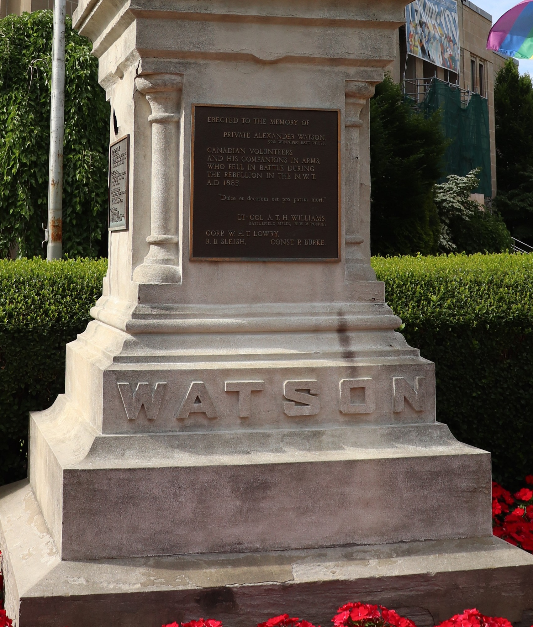 The Watson Monument was erected by the people of St. Catharines in 1886 in memory of Private Alexander Watson, 90th Winnipeg Battalion Rifles, Canadian Volunteers, and his companions in arms, who fell in battle during the North West Resistance in the Northwest Territories, A.D., 1885.