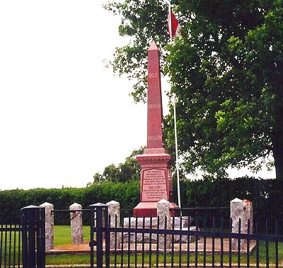 Erected by the village of Wawanesa, this memorial is dedicated to the local war dead of the First and Second World Wars. It was unveiled on 11 November 1921. It commands both the main street of the village and the top of a cliff flanking the River Souris. Stone columns enclose the monument and there is a fenced compound with flag pole to complete the site.