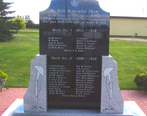 Dedicated to the men of Wawota and area who gave their lives during the First and Second World Wars, by the Wawota Royal Canadian Legion Branch 113, this memorial was unveiled August 3, 2008. It is made of black granite shipped from China, bordered by grey Canadian granite and sitting on a base of grey granite which in turn rests on a cement base. It is flanked by the Red Ensign which all these men fought under during the First and Second World Wars, the Canadian flag and the Saskatchewan flag.