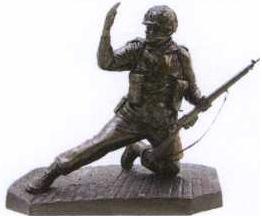 This sculpture, “THIS WAY!”, depicts a member of 1st Canadian Parachute Battalion on one knee on a cobblestone road, looking back over his right shoulder and signaling other members to follow him during the Normandy Drop. Since no experienced soldier would pause on an open road, the Artists suggests imagining that a near-by vehicle wreck provides the paratrooper with cover from the direction of the enemy. Furthermore, we assume he has already sighted a protected spot for his next tactical bound to pursue the assault. This paratrooper’s kit includes the unique items of uniform identification that distinguished Canadians from the British paratroopers: Canadian Jump Wings on his chest and a small ribbon on the epaulettes. This sculpture was erected in March 2013 by the Royal Military College of Canada, and is dedicated to members of the 1st Canadian Parachute Battalion, which was the first Canadian operational parachute unit. That unit was placed under command of the British 6th Airborne Division and distinguished itself in two major operational para-drops: the D-Day drop into Normandy, and the Rhine River drop.