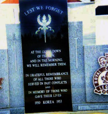 This memorial is dedicated to the war dead and veterans of the First and Second World Wars and the Korean War and was erected by Royal Canadian Legion Branch No. 155.
