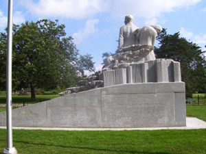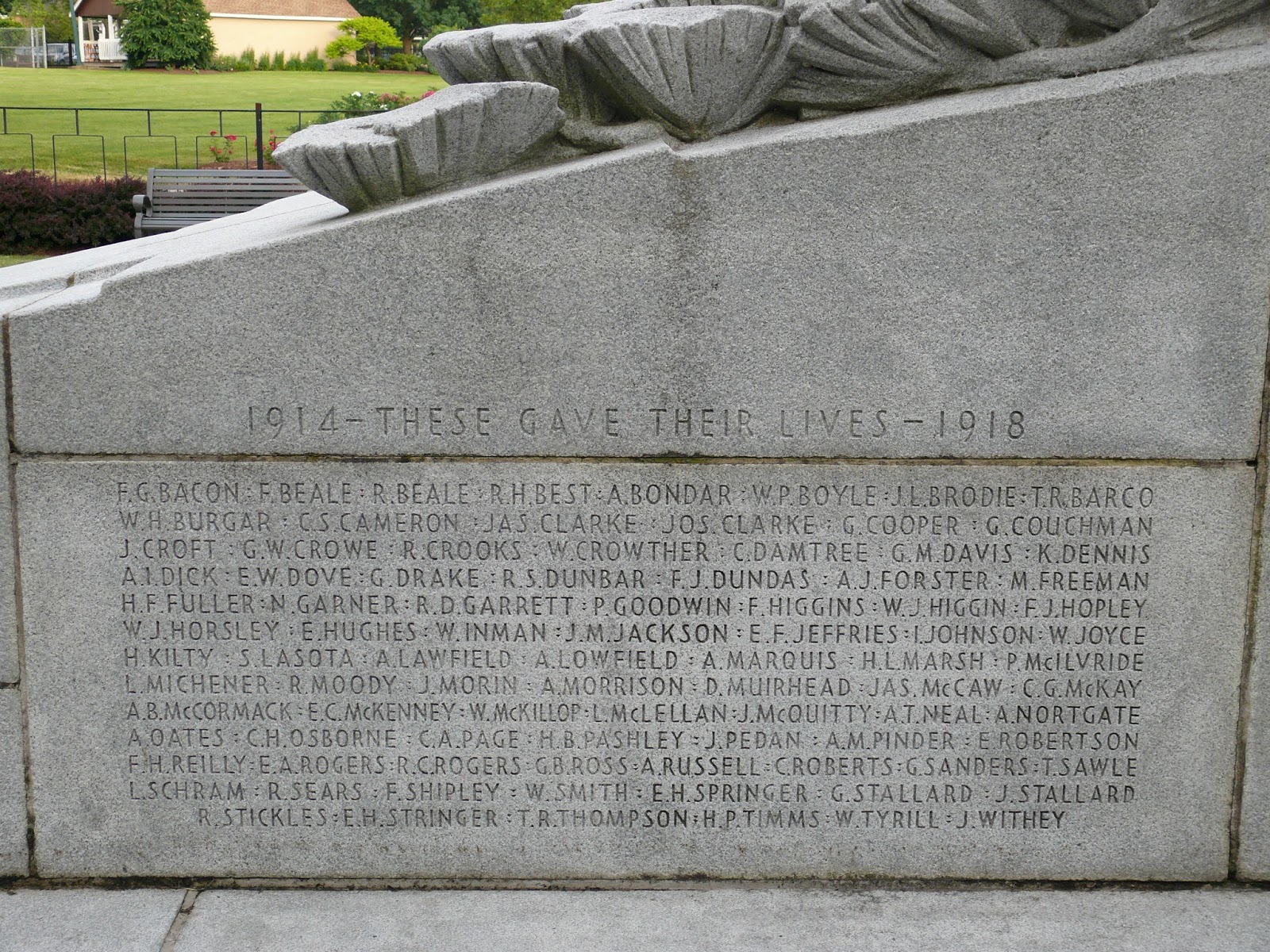The monument was executed in LaCass Granite from Quebec, and was cut to size by the Thomson Monument Company of Toronto from a full sized clay model done by Wyn Wood. Louis Temporale did the fine surface carving on the piece. Welland’s World War I memorial is unique in that it departs from the design of a single soldier so common on other monuments of that vintage to incorporate stylized elements of the Canadian landscape – red pine and wheat sheaves – along with the representation of a W.W.I trench mortar and two heroic figures – a soldier and a woman – intended to symbolize the “Service and Sacrifice” not only of those who fought but of those who supported the war effort at home. It was unveiled one day after the start of the Second World War on September 4, 1939 by Lieut. Colonel Archdeacon F. G. Scott, D.S.O., Senior Chaplain of the First Canadian Division during World War I and a noted Canadian poet.