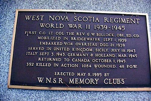 This stele was unveiled on 8 May 1985 by The West Nova Scotia Regiment Memory Club and is dedicated to the members of the regiment who served during the Second World War. Between the two plaques is a brass cap badge from the regiment. Refer to the following memorials: Bridgewater and Area Honour Roll: 12009-003 Bridgewater obelisk: 12009-004 Canada's Merchant Navy Plaque: 12009-002