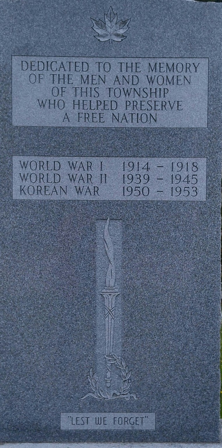 Two brothers on the cenotaph, Carson and Warrington Foy, were the sons of John and Mabel Foy. They died just weeks apart in the Second World War by friendly fire incidents. A Memorial Cross was sent to the family for each son, but were lost over time. In the fall of 2010, the medals were recovered from eBay and prepared for final display in the Westmeath Hall.