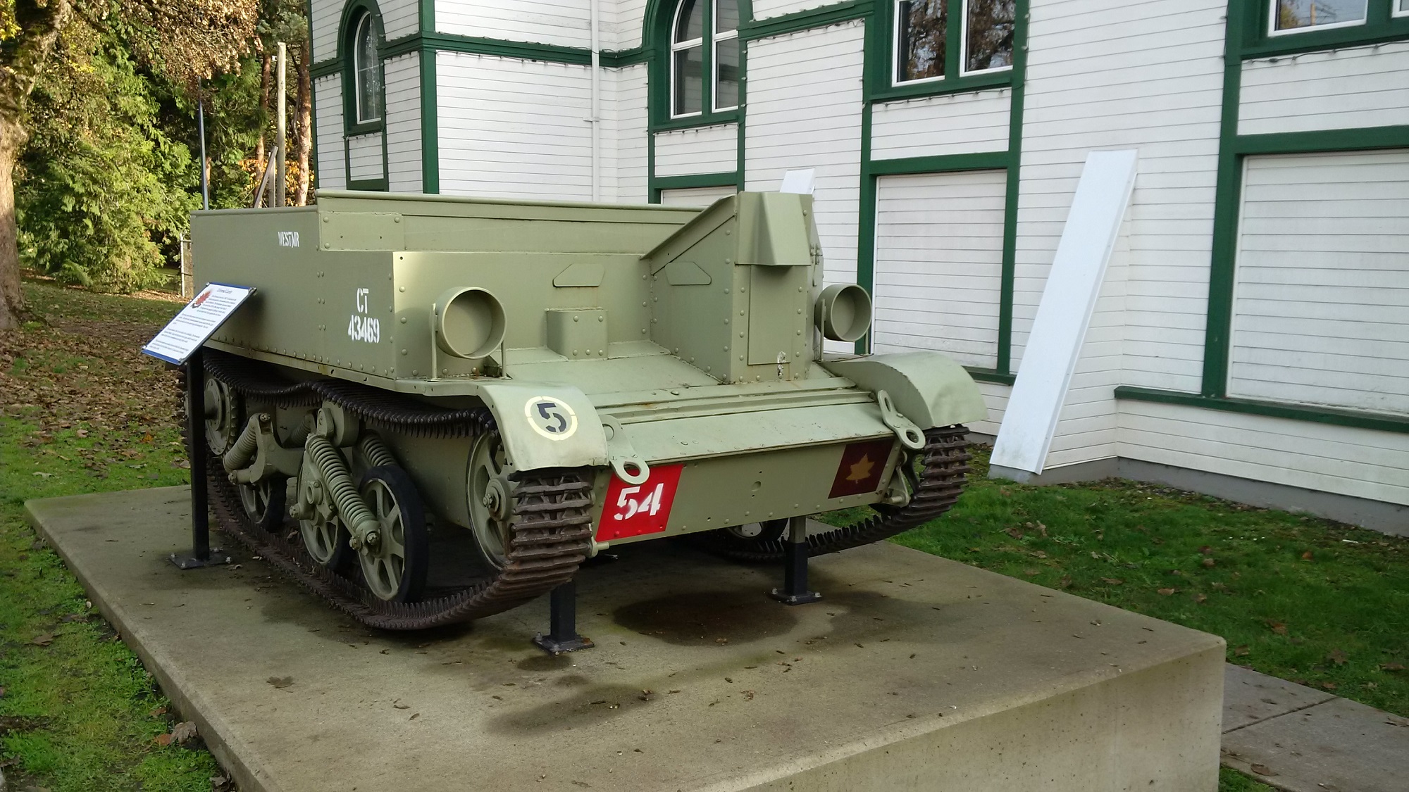 This universal carrier, called the "Bren Gun Carrier," was erected by the Royal Westminster Regiment Association as a memorial to the members of the 1st Battalion and 2nd Battalion, The Westminster Regiment (Motor) who served in the Second World War. It was unveiled on November 9, 2014, with Commanding Officer Lieutenant-Colonel Dave Vernon accepting the dedication.