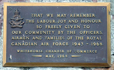 This memorial is dedicated to the Canadian Army personnel and to the Royal Canadian Air Force. The plaques were erected by the Whitehorse Chamber of Commerce.
