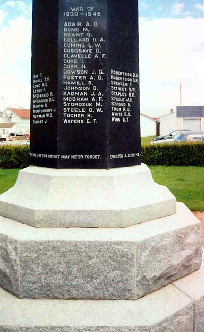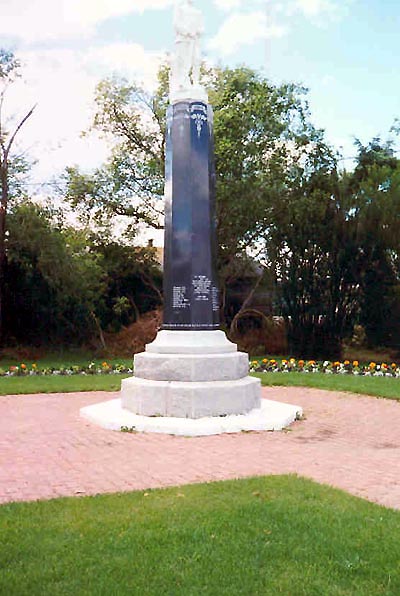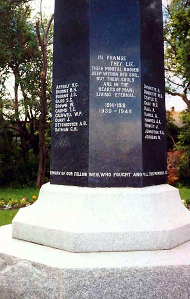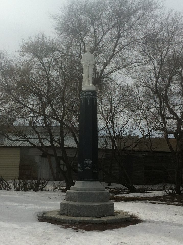 The memorial is the community's tribute to the brave people who gave their lives for the cause of freedom. The marble statue was unvieled after World War I. The flower beds are maintained by the local Branch of the Royal Canadian Legion.