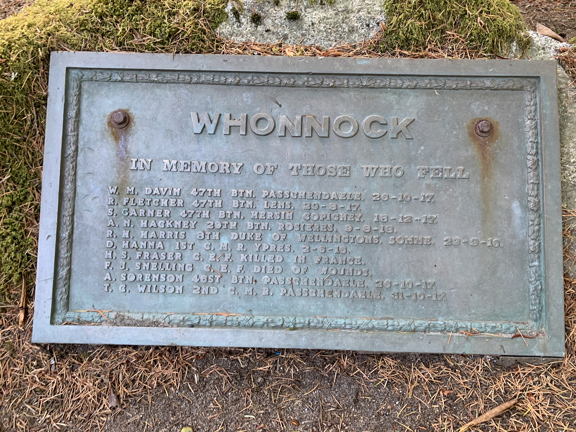 This plaque was first placed above the main entrance of Whonnock Memorial Hall in 1921, in memory of those from the Whonnock district who fell in the First World War. After the hall was demolished, the plaque remained on the same property, but was placed on a concrete cairn. It was then moved in 1988 to its current location at the Whonnock Lake Centre.