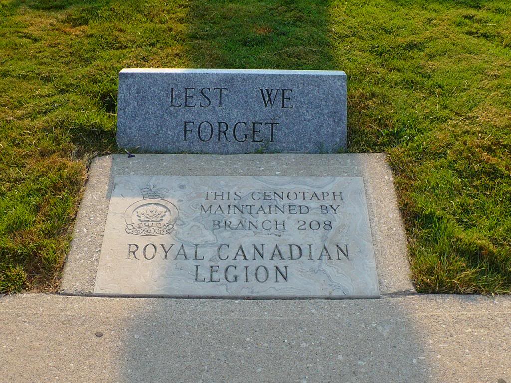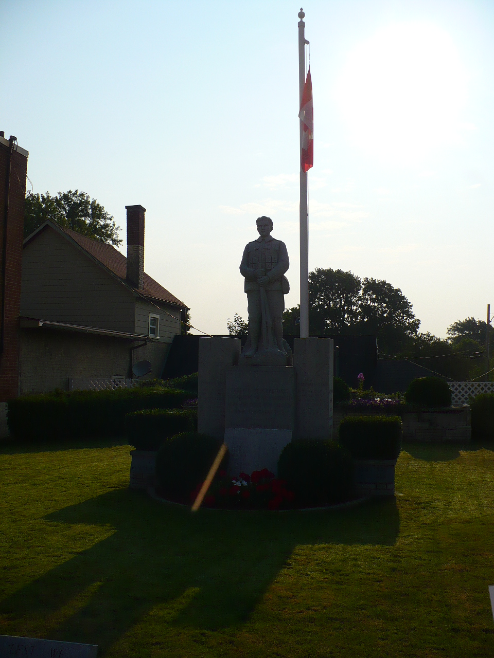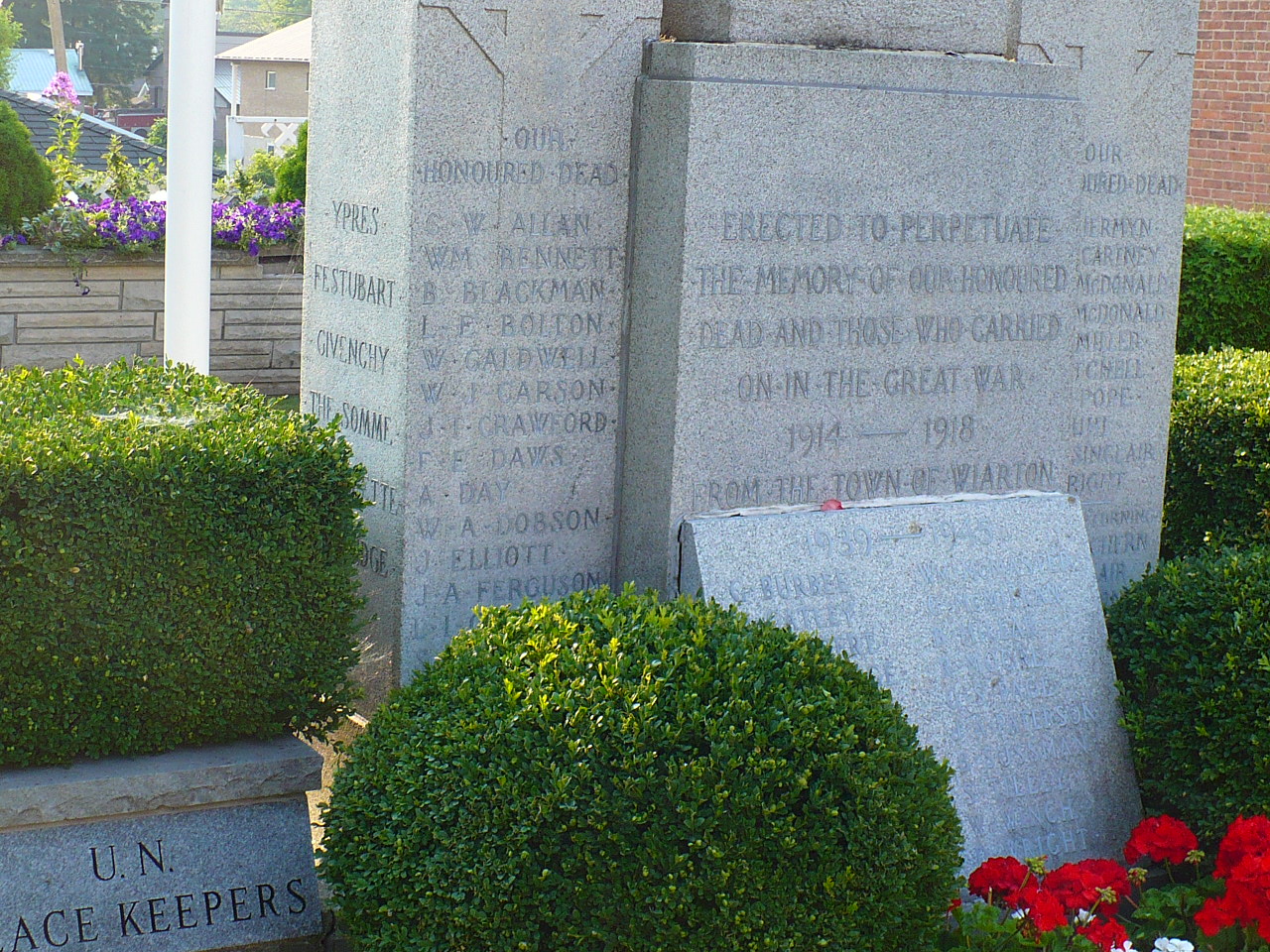 The Wiarton Cenotaph was unveiled in 1922. The limestone for the memorial was sent from England and depicts a lone First World War male soldier standing at rest, grasping his rifle in front of him. J.S. Cook & Sons of Wiarton worked to erect the monument at a cost of $3,000. The names of those killed in the First World War were etched into its stone, while names of those who lost their lives in the Second World War were later added. Dates were added for the Korean War and United Nations Peacekeepers were recognized on the inscription.