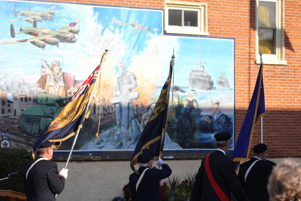 The mural at Royal Canadian Legion Wiarton Branch 208 was a community initiative commissioned in 2005 (Year of the Veteran). It depicts the First World War, Second World War and Korean War with Navy, Air and Army images. The mural hung on the wall adjacent to the Wiarton Cenotaph, measures 12' by 22' and was painted by local artist Tim Noble. It was damaged by water in 2021 and replaced with a new mural in 2024.