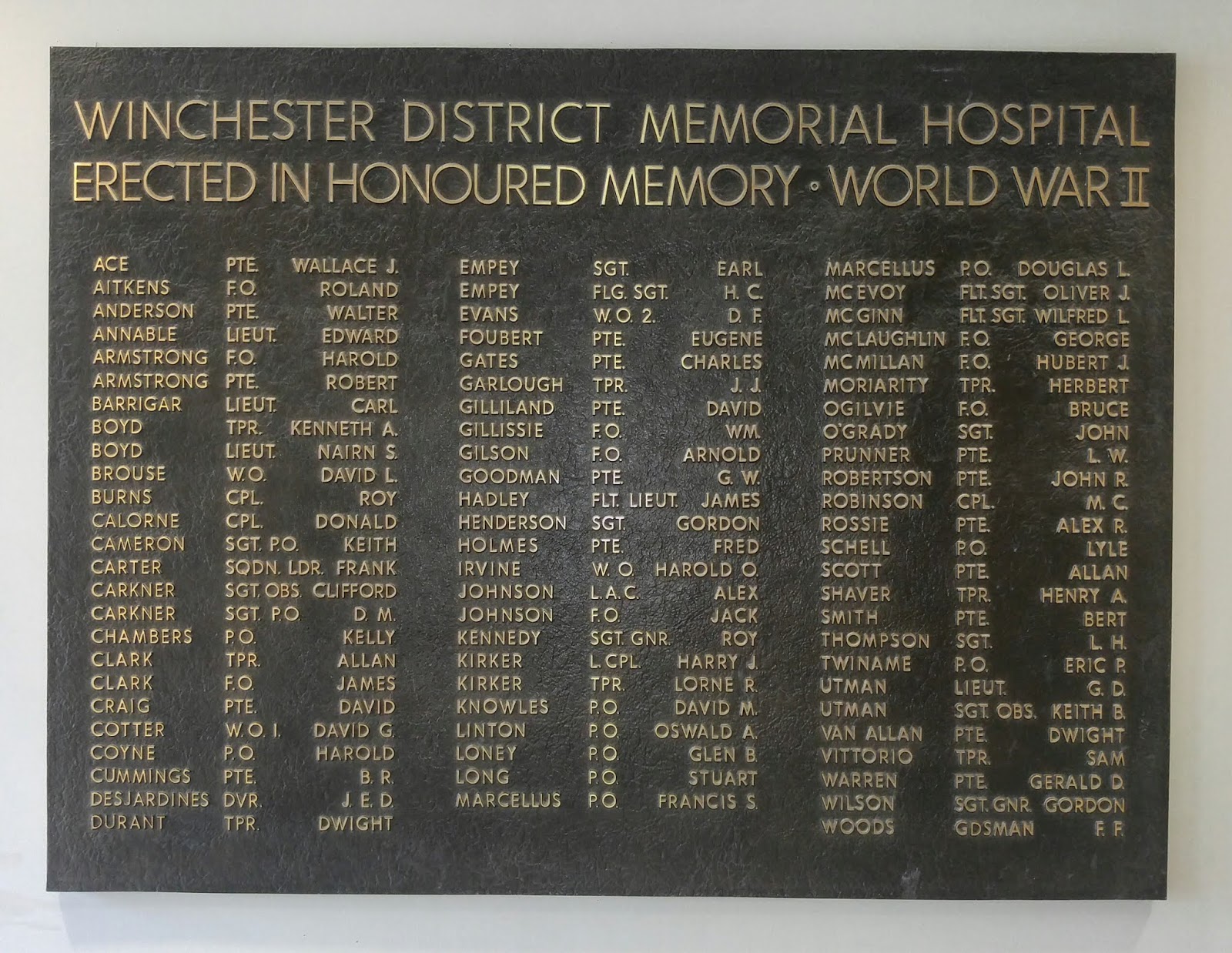 This plaque, located inside the Winchester District Memorial Hospital, is dedicated to members who died during the Second World War and is inscribed with their names.