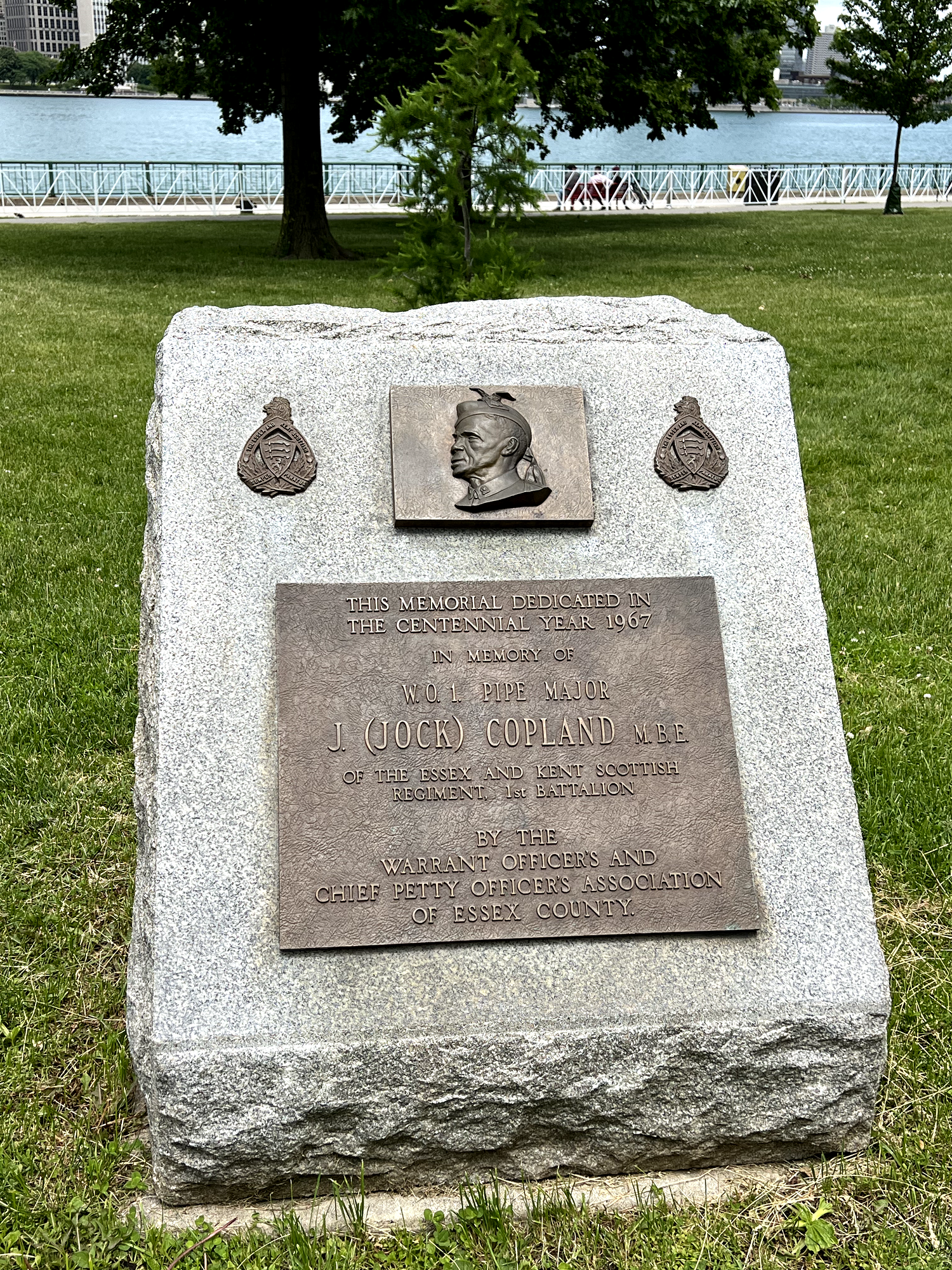 This memorial was dedicated in 1967 in memory of WO1 Pipe Major J. (Jock) Copland MBE of the Essex and Kent Scottish Regiment 1st Battalion. It was erected by the Warrant Officers and Chief Petty Officers Association of Essex County.
