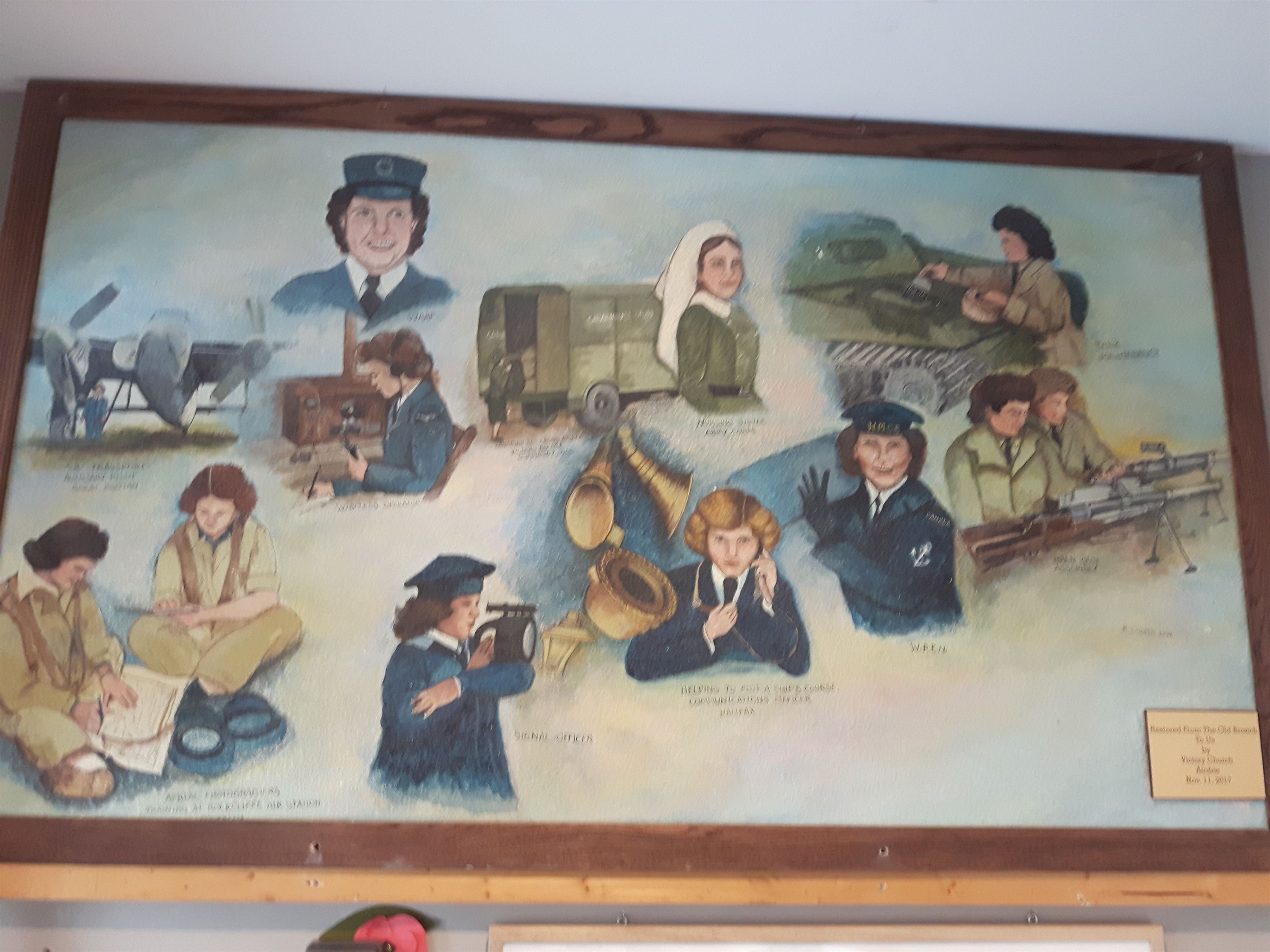 Painted by local artist Robyn Cooper of Airdrie. Dedicated in memory of the service of women in World War II. Images of the following Corps: Canadian Women's Army Corps, Women's Royal Canadian Naval Service (Wrens), RCAF (WD) and Nursing Sisters.