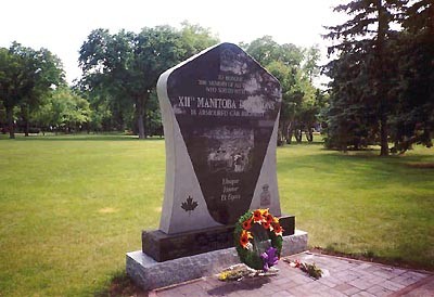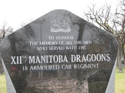 This memorial was erected by the XIIth Manitoba Dragoons Association in memory of all those who served with the XIIth Manitoba Dragoons, 18 Armoured Car Regiment, during the Second World War. Unveiled on 3 June 2000, the monument depicts, in addition to the inscription, the cap badge of the regiment, a Second World War image of an armoured car, a maple leaf and the symbol for the Royal Canadian Legion.