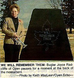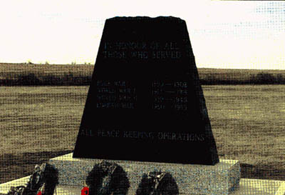 The Youngstown War Memorial was dedicated November 10th, 1999 in memory of all those who served in the Boer War (1899-1902), First World War (1914-1918), Second World War (1939-1945), the Korean War (1950-1953), and all Peace Keeping operations. The Memorial was planned and paid for by the Youngstown Cemetery Association, which is funded primarily by private donations. Remco Memorials did the construction and installation at cost, and Dale Crowle and Gladdish Construction, who prepared the concrete base, also made a generous donation to the Youngstown Cemetery Association. Excerpt from the Oyen Echo, November 16, 1999: Members of the Hanna Royal Canadian Legion #25 and guests from the Oyen Branch #208, students and staff of the Youngstown School and community members gathered for the dedication of the war memorial at the Youngstown Cemetery. In his dedication speech John Goodbrand, chairman of the Youngstown Cemetery Association said: "Today we commemorate 100 years of Canadian who served our country in the cause of justice, patriotism and freedom." A list of those who served from each of the four wars mentioned on the memorial, who has ever lived in the Youngstown area follows: Please note, that in the Second World War list the name *Roseland, Arnold Walter. He lived in the area as boy and in the July 14, 1999 issue of the Toronto Star he was named "The Unknown Canadian" after 55 years. BOER WAR VETERANS Athaws, Billy Creighton, Dr. James F. Donaldson, Charles A. Goodbrand, Alexander Meyer, Jake Munroe, Henry Smith Sutherland, Earl Synnuck, Harry Western, Tom FIRST WORLD WAR * Adshead, Harry Allan, William Anderson, Walter E. Arbogast, Charles B. Archeson, Ross Armstrong, George E. Auld, Paul Bain, Gregor * Baker, Bernard, G. Baker, C.C. * Baldwin, Jas. Alfred Baldwin, Reginald Barlow, Percy * Barnes, F.F. Batson, Cliff Beeton, George * Bennett, Rev. A.J. Bethel, P.F. Bilton, A.L. * Bonser, Edward T. Bourne, Henry Brady, Paul J. Brotherston, D.H. Brotherston, L.A. Brown, William * Brownell, Harry Bryan, William Burkhold, Ed Campbell, A. Campbell, Jack Ceser, E.C. Chapman, R.F. * Choate, Harold Church, Edwin Coke, U.V. Colpitts, L.M. Cotter, Charles Cragg, W. Cross, W.W. Cummer, Jack Cummings, W.J. Curtis, --- * Curtis, Joe Curtis, W.E. De Young, Arthur De Young, Wilfred Deverauex, M.T. Dickeson, Donald * Diffey, Herbert Dinwoodie, Dick Dinwoodie, George Dunnill, Stanley Edler, George Wesley Elliot, Jack Elmere, L.L. Enderton, Homer Falk, Harry W. Frakes, Robert Garland, R. Garlock, George Edward Garlock, Willard Edward Gaucher, John Sr. Genest, Alfred Goodbrand, John Goodwin, Richard Gough, W.H. Gray, Alex (British Army) Greig, Peter Griffiths,George Hagen, Benjamin * Hammond, G.A. Hart, Dr. Hugh H. Hart, Jerry Heasley, Wilfred * Heller, Dick * Herold, Ray C. Holbrook, Clyde Holmes, A. Huggins, Jack Hunter, Edward James, Norman Jenson, J. Jespersen, D.H. Jones, Lawrence Kay, Scotty Kidder, Harvey Kidder, Victoria H. Kirby, Frank * Koplin, William (died in camp) Leslie, George Loper, --- Lowe, James A.R. Lowther, C.W. * MacMillan, Wm. (died in camp) Manion, Arthur Austin * Marchant, --- Martin, Arthur Mather, Thomas Maw, John McCarthy, James * McColl, Douglas C. McDonald, D.M. McKay, Dan McKellar, Edmond McKinley, Clark McLean, J.D. McLean, Laughlin * McLeod, D.N. Middleton, Alex * Miller, E.J. Morrison, A.E.S. Muirhead, John M. Murphy, William D. Nasmyth, W.W. O’Hara, Barney Orrick, J.R. * Orrick, Joe (accidentally killed) Osborne, John Osmond, S.C. Paterson, William Pines, H.C. Portier, R.H. Pratt, E.L. * Quanberry, J.H. Reiner, Gotlieb Riley, Harry Ringrose, Frank Ross, Donald N. Shaw, George Shelton, W. Shepard, Ambrose Siegrist, Earl Simpson, Thomas C. Slingsby, E. * Smith, D. * Smith, Herbert Smith, W. * Spalding, Geo. Spencer, E.W. Sprotson, Dr. Stacey, L.G. * Stephenson, --- Stewart, Charles V. Stewart, Wilbur Sully, John A. Synnuck, Jack Tanner, Tom Tate, L.C. * Telfer, Andrew Tetlock, Cecil * Tinlin, W. (died in camp) Tovey, Edgar Trimner, Eldon Trogan,Eldon Trogen, Everet Trostle, Harry Turmoth, G.D. Twyning, W.S. Van Brunt, George * Van Brunt, H.G. Van Dyke, A. Vinton, Frank * Vinton, Fred Vinton, John * Wade, Harry Walsh, J.G. Watson, Ernest Watson, Robert Watt, Bruce White, A.E. White, M. * White, --- (died after returning) Whyte, M. Wigley, Art Wood, B.A. Zehren, J. SECOND WORLD WAR Allsopp, Allin Anderson, George Anderson, Gordon Anderson, Ray Anderson, Wilfred Andrew, Norman Armstrong, Jim Armstrong, W. Ashmore, Robert Auld, Walter Bannick, Herb Bartman, Gordon Bartman, Lloyd Barton, Donald Beamish, Emily Beamish, Winifred Berg, Art Berild, Chris Berild, John Bertsch, Bill Blair, Harry Blair, Robert * Bohush, Eugene Bohush, Russell Boswell, Jim (British Army) Brewer, Allen Buckley, Joseph Buckley, Thomas Burrows, Norman Butler, (Hampton) Elsie Butler, Jack Clark, Alfred Clark, Ralph Clark, Wesley Clarkson, Douglas Coad, Ransom Coffin, Delbert Coffin, Keith Coultis, Violet Daley, F.J. Day, George Demaere, Ted Dewey, William H. Douglas, James * Douglas, William Lloyd Eccles, Gorm Edwards, Charlie Edwards, Dave Edwards, Kenneth Elliot, Jim Elliot, Tommy Elliott, Harvey Gaucher, John Sr. Gaucher, John Jr. Gaucher, Lloyd Givens, George Goodbrand, Jim Gordon, Albert Gordon, Charles Gordon, Jack Gordon, W.A. (Ab) Greer, Bill Grover, (Smereka) Lois Gurnett, Bill Hall, Norman Hall, Wesley Hettler, Adam Hettler, Joseph Hughs, George Hunter, Eddie Hunter, George Hunter, Gordon Hunter, Harry Hunter, Ted * Jackson, Henry Jackson, Mary Johnson, Earl F. Johnson, Norman Johnson, Ralph Johnson, Ted Kachman, Roman Kerner, Jim King, Alex Kleven, Everett Kuczma, Alexander Paul Larson, Ernie Laughlin, John Laughlin, Mervin Lougheed, George Lougheed, Lloyd Lynn, James Jr. MacDonald, Jim Maxwell, Thomas McKeage, J. Mellom, Alden * Mellom, Arthur Mellom, Clarence Mellom, Julius Mellom, Lawrence Munroe, Alex Munroe, Arthur Munroe, Jack Naismyth, John Niles, Isabel Paetz, Henry Pahl, Emerih Pah