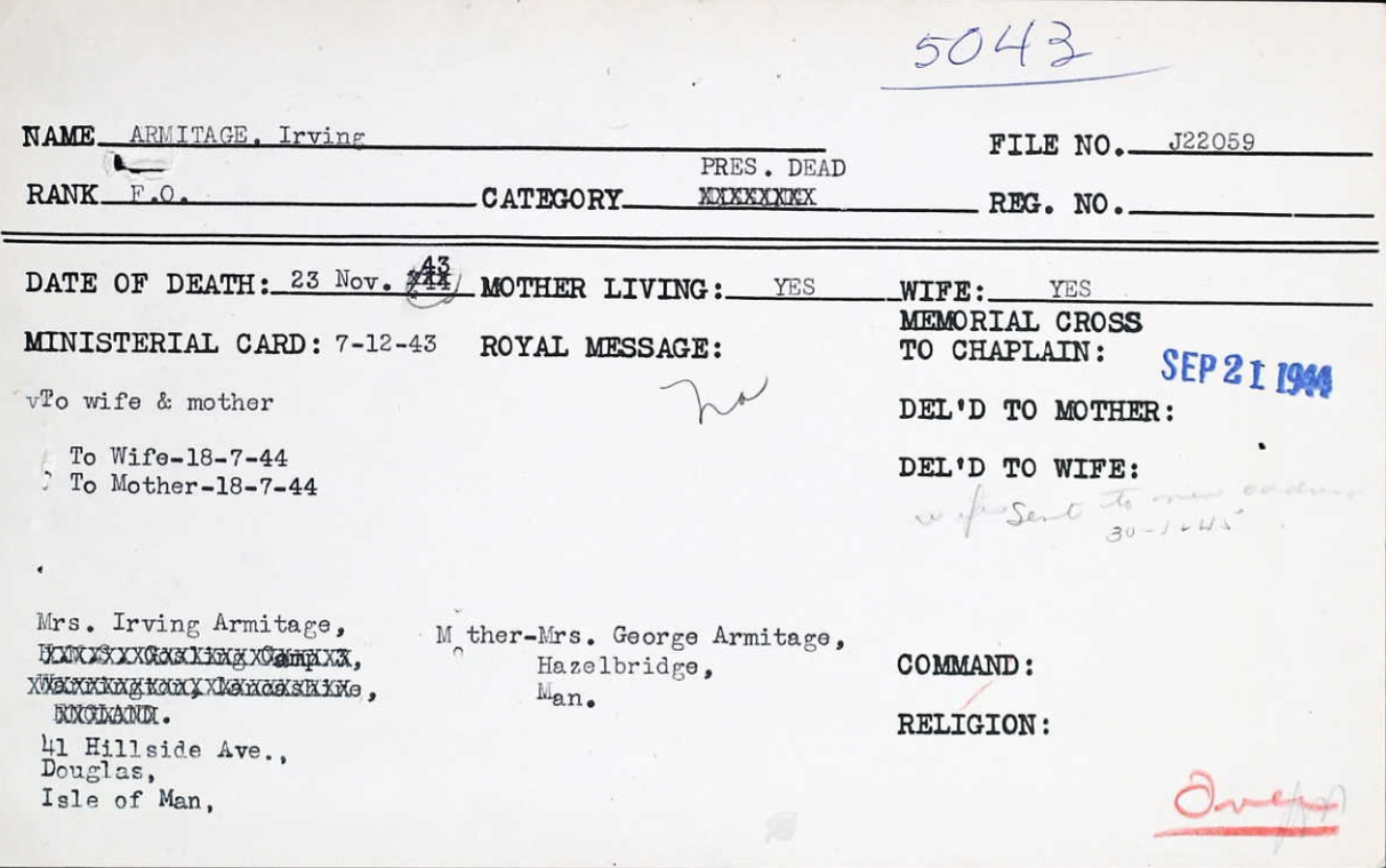 Irving Armitage was one of 10 children of George and Adrianna Armitage of Wauchope, Saskatchewan.