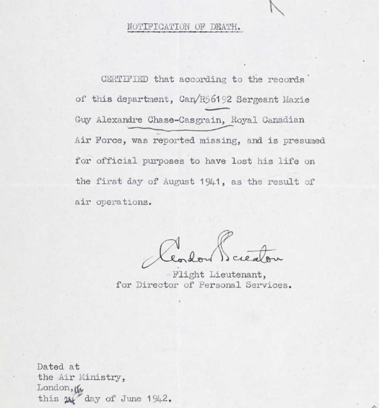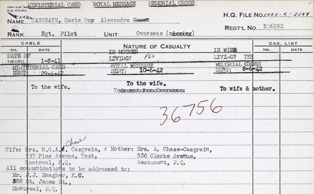 Brother of Airman Thomas Chase-Casgrain, of the Royal Canadian Air Force, who fought in Europe and survived the war.