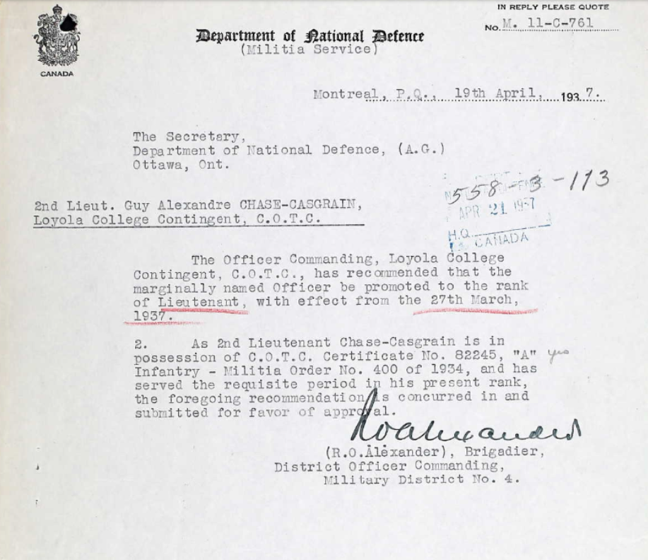 Lawyer by profession, he was an Army second lieutenant from 1934 to 1939, then lieutenant from 1939 to 1941 - COTC training in internal combustion engine given by the Royal Canadian Naval Volunteer Reserve, as well as training Morse code and semaphore.