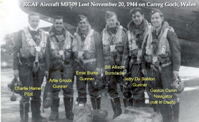 The RCAF crew took off from the Stratford-upon-Avon airfield on a night training mission. Shortly before 9:00 p.m. the crew radioed that they were having trouble with the starboard engine. Minutes after they received permission to drop below cloud cover the MF 509 aircraft slammed into the terraced southwest face of Carreg Goch in the Brecon Beacons mountains in Wales. The cause of the crash was listed as pilot error.