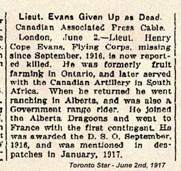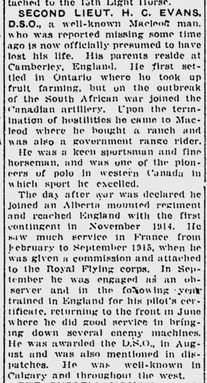 Son of Alice M. Evans of West Point Camberley, Surrey, England. Lieutenant Evans had previous with the Canadian Artillery, "C" Battery in the South African War. He stated that he was single and employed as a rancher. For a period of time,prior to the war, he was engaged in fruit farming in the Province of Ontario, then returned to ranching. He joined the Alberta Dragoons and went to France with the first contingent.