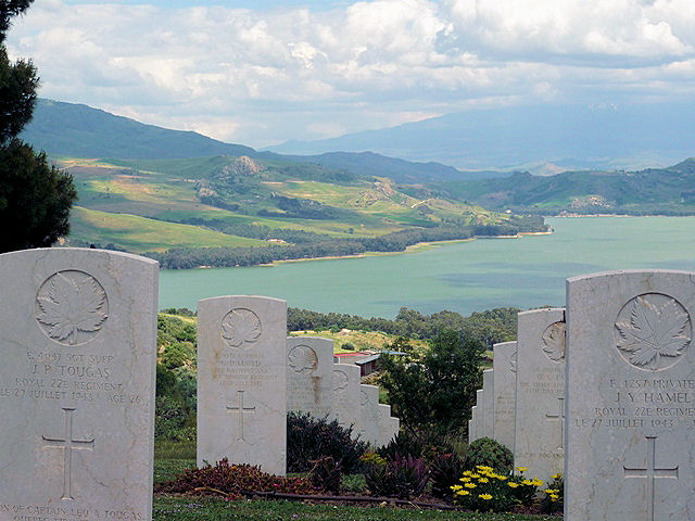 On 10 July 1943, following the successful conclusion of the north African campaign in mid May, a combined allied force of 160,000 Commonwealth and American troops invaded Sicily as a prelude to the assault on mainland Italy. The Italians, who would shortly make peace with the Allies and re-enter the war on their side, offered little determined resistance but German opposition was vigorous and stubborn. The campaign in Sicily came to an end on 17 August when the two allied forces came together at Messina, but failed to cut off the retreating Axis lines. Agira was taken by the 1st Canadian Division of 28 July and the site for the war cemetery was chosen in September for the burial of all Canadians who had been killed in the Sicily campaign. Agira Canadian War Cemetery contains 491 Commonwealth burials of the Second World War.