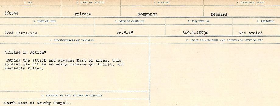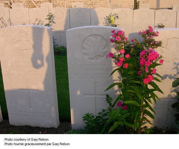 Enlisted for the first time on 25 February 1915 with the 41st Battalion, Canadian Expeditionary Force, regimental number 416443, he stated that he had been born on 10 September 1890. On 31 December 1915, he enlisted again with the 163rd Battalion, regimental number 660054, stating that he had been born on 10 September 1891. On an unknown date, he was sent to Bermuda until 18 November 1916, when he went to Halifax, Nova Scotia. Arriving in England on 6 December of the same year, he was posted to the 10th Reserve Battalion on 7 January 1917, then to the 150th Battalion on 26 February 1917. He was transferred to the 22nd Battalion on 20 April. On 30 May 1917, he was wounded in action in France. On 15 August 1917, he was gassed. From 28 October to 17 November 1917, he was posted to the Canadian Corps Reinforcement Camp and returned to the 22nd Battalion. On 8 April 1918, he was gassed again in France. On 28 May, he returned to the front line. He was killed in action on 26 August 1918 at Beaurains near Arras, France.
