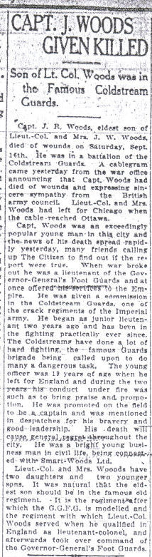 Commemorated on the Royal Ottawa Golf Club War Memorial, Captain John Russell Woods Plaque and Captain John Russell Woods Window.