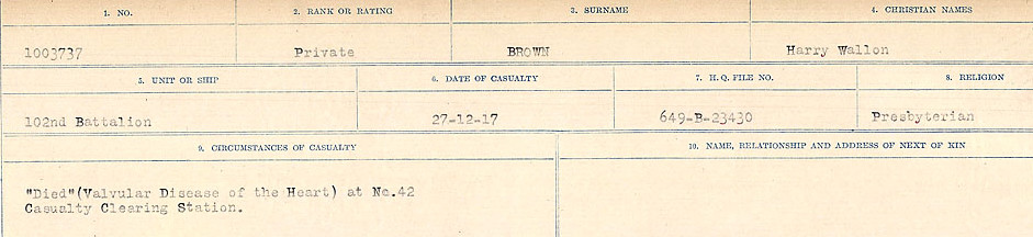 Son of Allen and Mary Brown, of Big Lake, Manitoulin, Ontario. He enlisted at Mindemoya in the 227th Overseas Battalion, CEF.