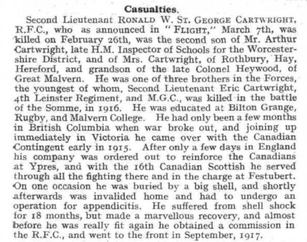 Son of Arthur and Ellen Mabel Cartwright, of Rothbury, Hay, Hereford.