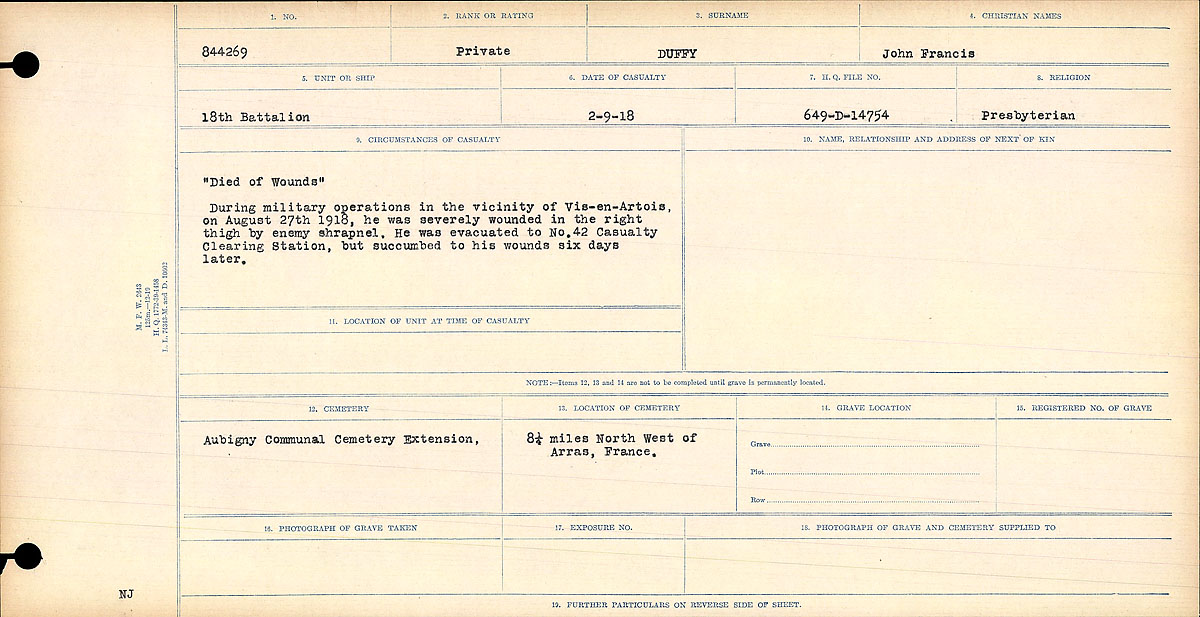 Aubigny Communal Cemetery is south of the village of Aubigny-en-Artois and the Cemetery Extension is behind it. The village of Aubigny-en-Artois is approximately 15 kilometres north-west of Arras on the road to St. Pol. After turning into the village from the N.39 on the D.75, the Cemetery lies south on a road leading from the centre of the village.