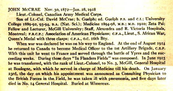 John McCrae began writing poetry while a student at the Guelph Collegiate Institute. As a young boy, he was also interested in the military. He joined the Highfield Cadet Corps at 14 and at 17 enlisted in the Militia field battery commanded by his father.