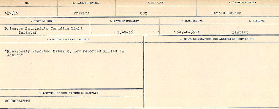 Courcelette is a village some 10 kilometres north-east of the town of Albert, just off the D929 road to Bapaume. The Courcelette British Cemetery is approximately 1 kilometre west of the village on the south side of a track, suitable for cars, from the secondary road from Courcelette to Pozieres. The route is signposted in the village.