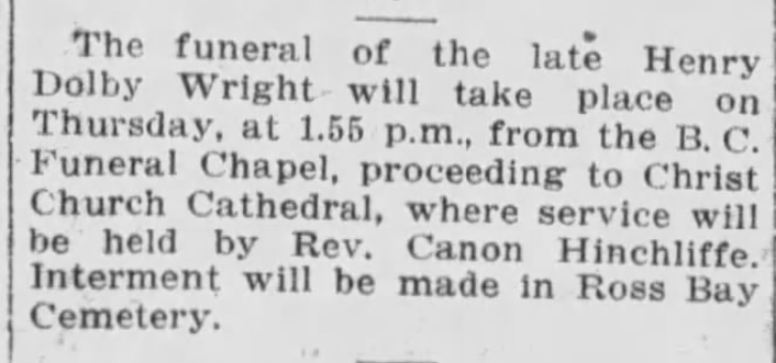 Son of William Henry and Mary Wright (nee Freeman). Husband of Gertrude Wright, of 1082, Richmond Avenue, Victoria, British Columbia.