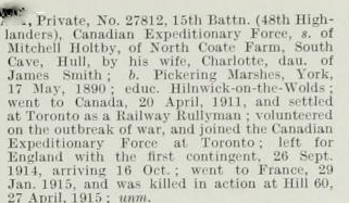 Son of Mitchell and Charlotte Holtby, of New Swanland, Hull, England. Pte Holtby stated he was single and employed in civilian life as a skilled labourer. He sailed overseas on the SS Megantic on 4 October 1914.