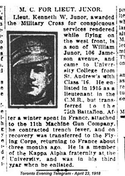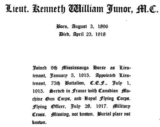 Son of William and Alice E. Junor, of 106, Jameson Avenue, Toronto, Canada.