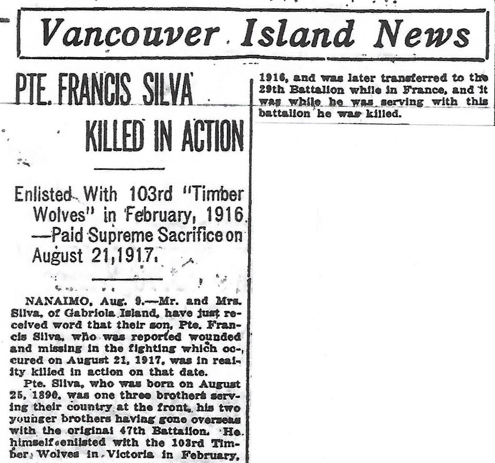 Son of John and Louisa Melanie Silva of South Gabriola Island, British Columbia. Brother of William, Isabella, Mary (Matilda), Joseph, Jacob, Angeline, William, Louise, Frank, John, Louis and Edward.