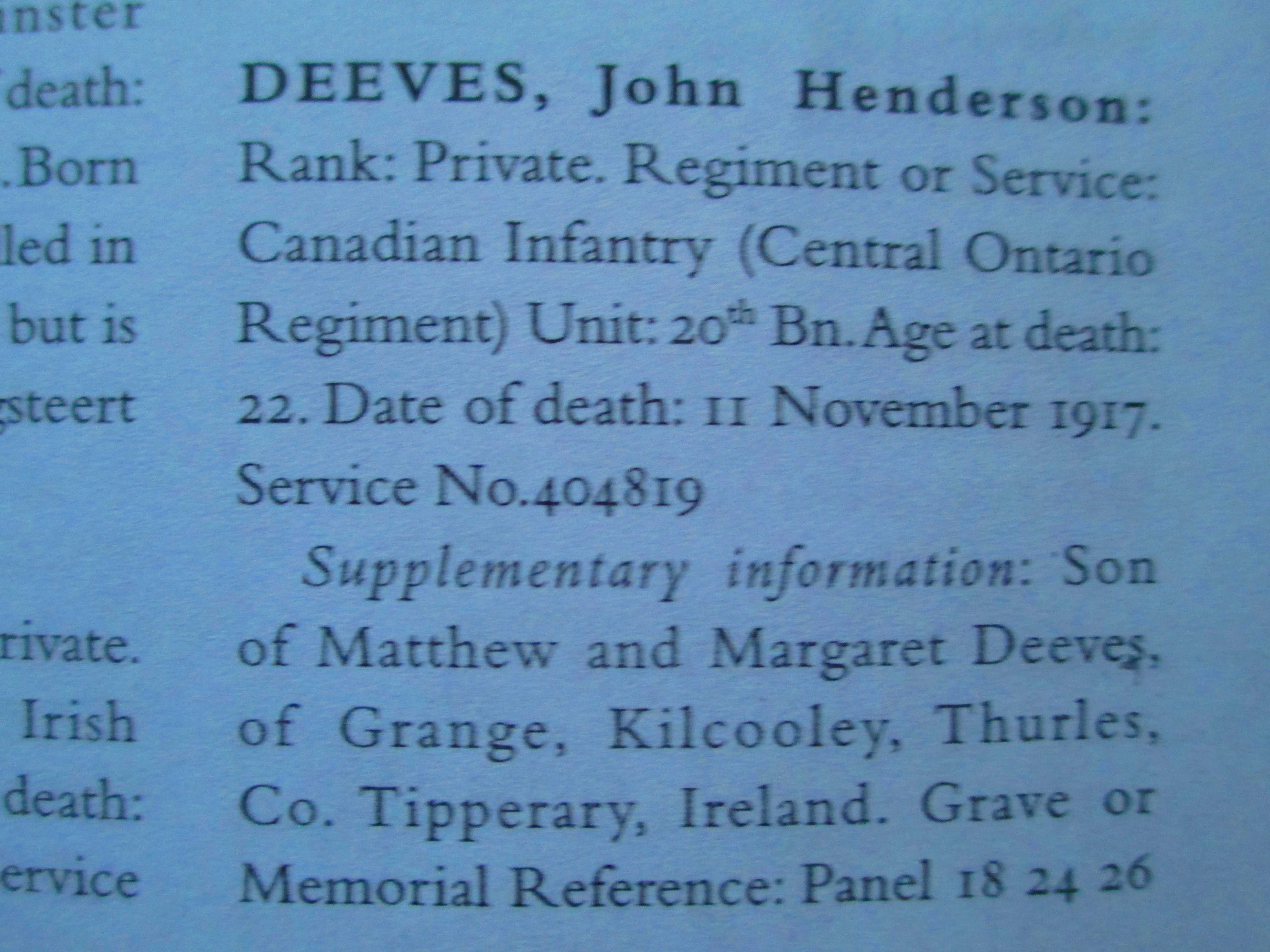 Son of Matthew and Margaret Deeves, of Grange, Kilcooley, Thurles, Co. Tipperary, Ireland.