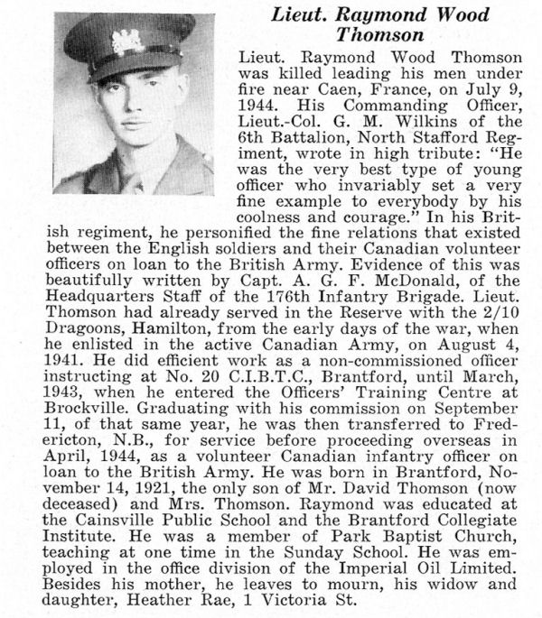 Raymond Thomson was a member of the Royal Canadian Infantry Corps, he died while serving with the North Staffordshire Regiment as a CANLOAN Officer.