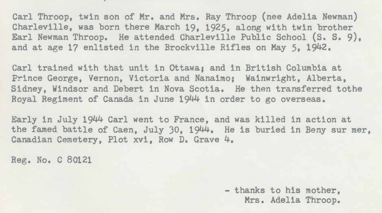 Son of Raymond Henry and Jane Adelia Throop, of Domville, Ontario.